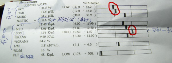 血小版的指數也低的嚇人,不過醫生說是因為百吉太緊張,有一部份的血抽出來就凝固了,所以血小版已經被用掉。