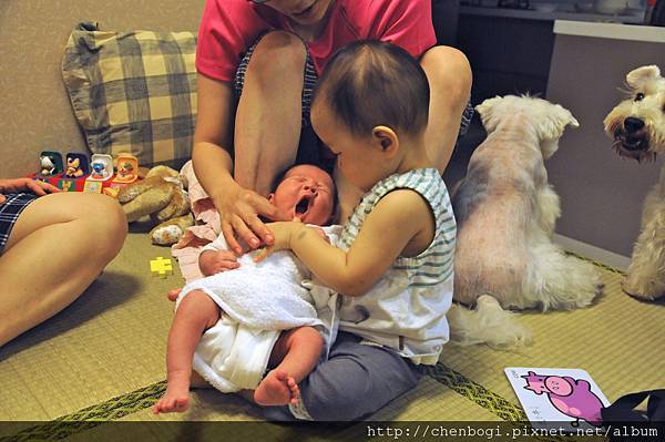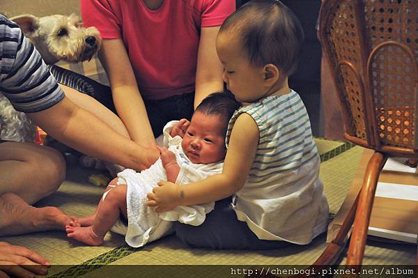 也許就是這樣的態度,所以在寶寶出生後,百吉是跟著大人們瞎忙豁(真的不知道他到底再忙什麼?),